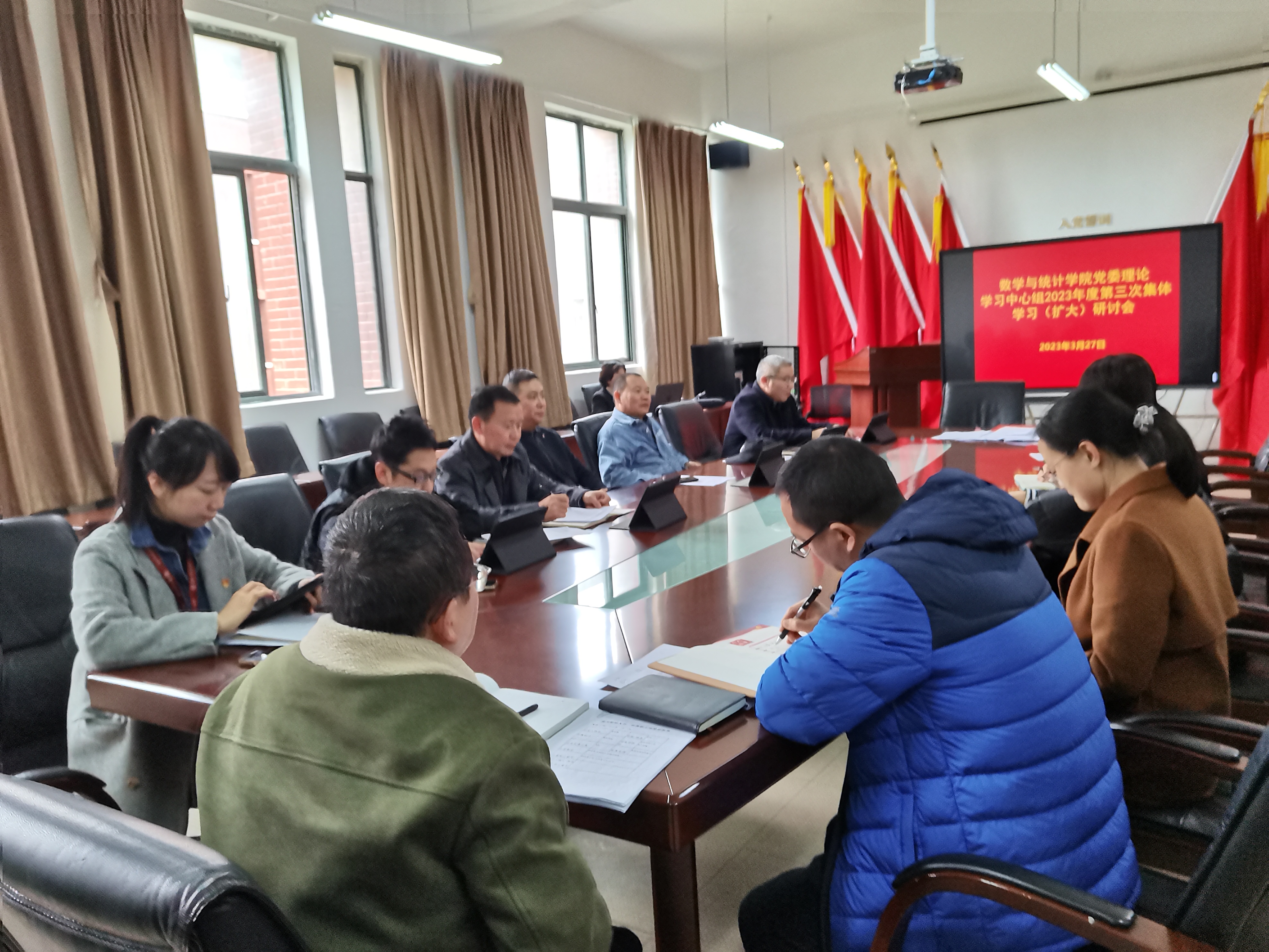 3月27日下午,小象直播 党委理论学习中心组在志学楼331会议室召开2023年度第三次集体学习(扩大)研讨会,学院党委领导班子成员、各科室负责人、支部书记及辅导员参加会议,院党委书记虞帆主持会议。
