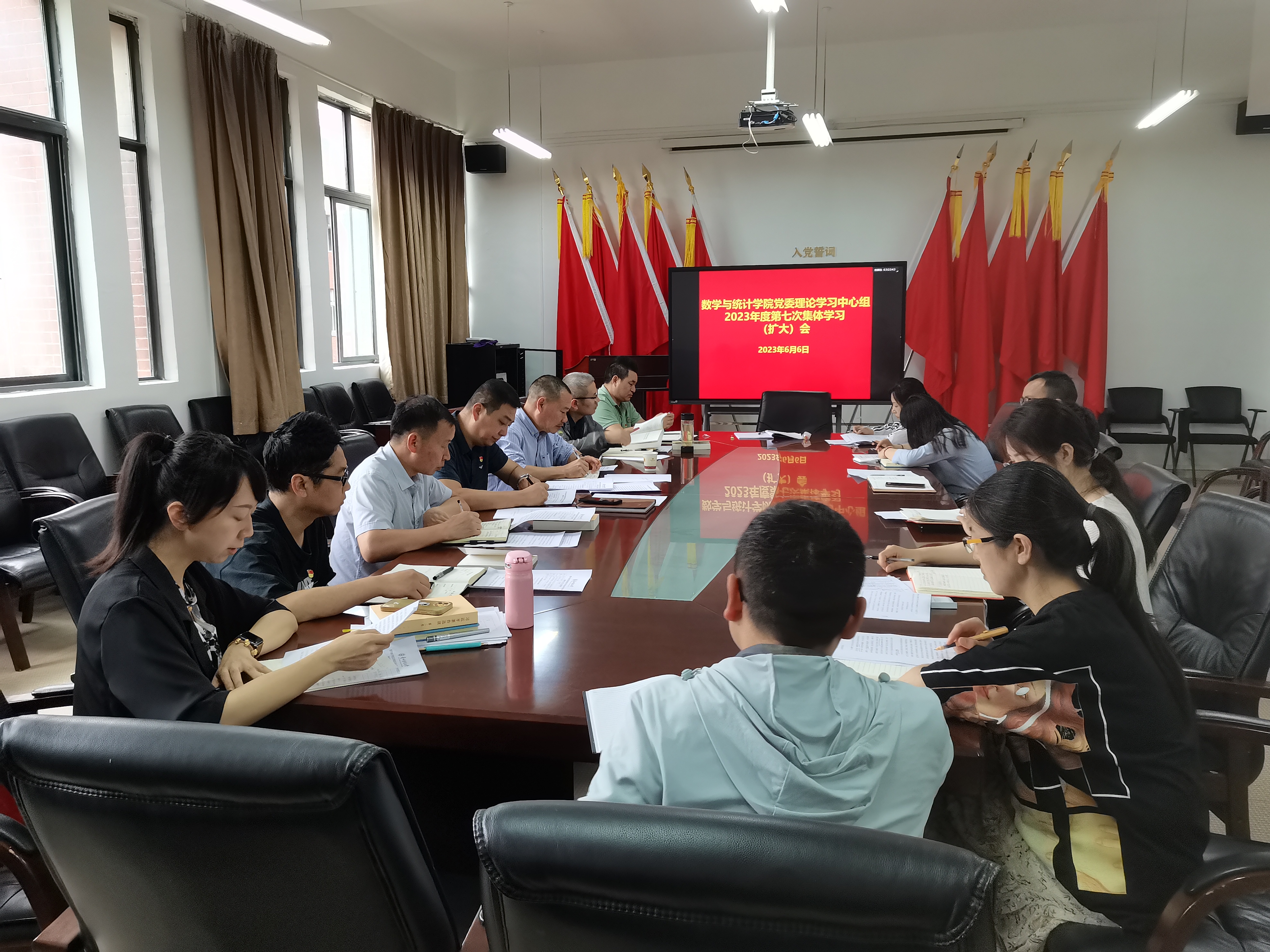 6月6日上午,小象直播 党委理论学习中心组在志学楼331会议室召开2023年度第七次集体学习(扩大)研讨会,学院领导班子成员、各科室负责人、各支部书记参加会议,院党委书记虞帆主持会议。
