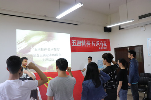 在当天的活动中,通过观看视频重温100年前那段激情燃烧的岁月,让同学们加深对五四运动历史意义和时代价值的认识。同时,开展“五四精神·传承有我”励志故事宣讲会,从五四先驱李大钊、蔡元培的壮举,到时代楷模黄大发、邓迎香的感人事迹,再到创业先锋坚持不懈的努力等,一个个励志的故事给所有同学上了生动的一课。最后,开展新团员入团仪式,庄严的宣誓、同唱团歌,让所有团员接受了一次思想的升华和心灵的洗礼。