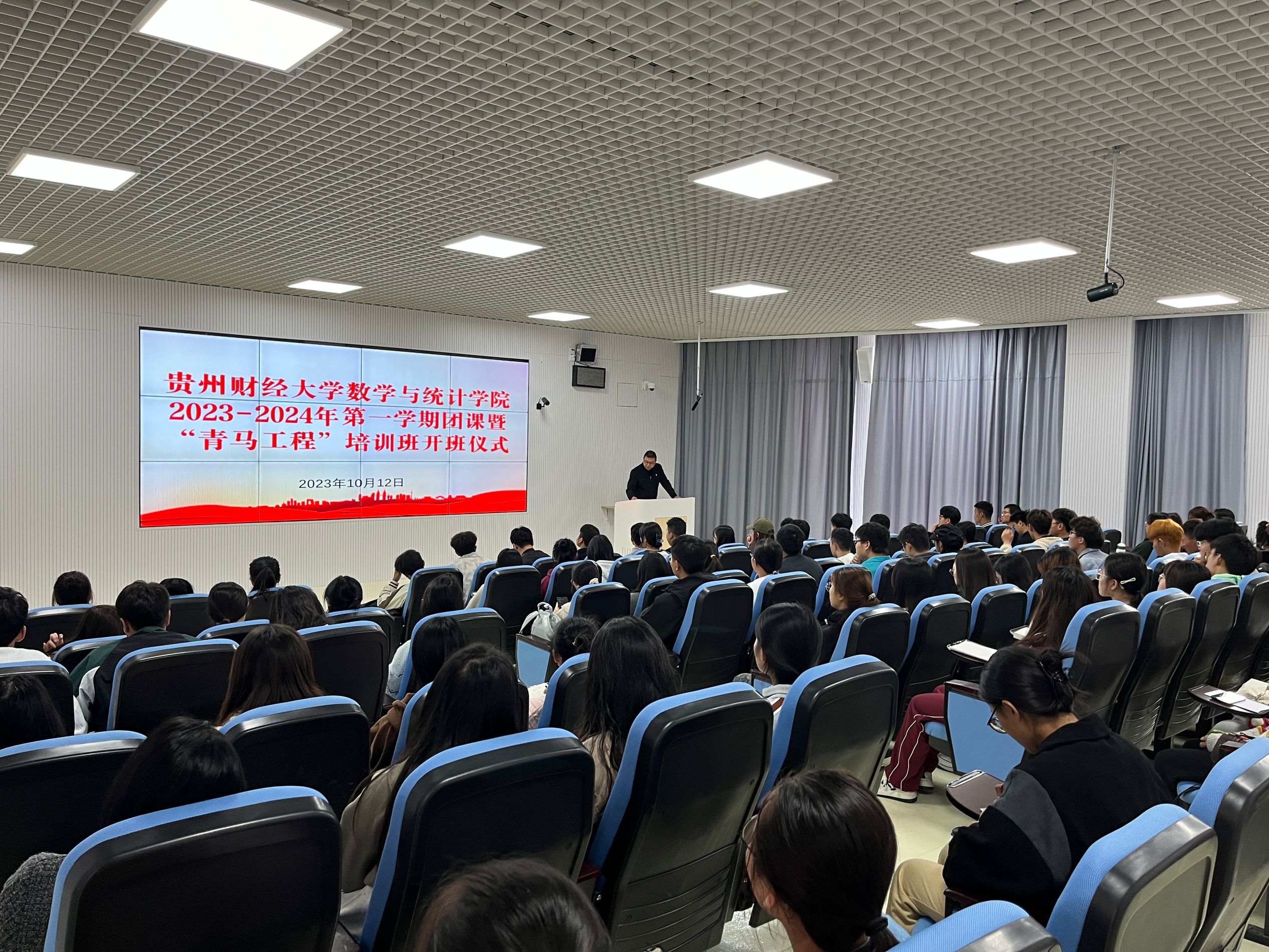 2023年10月12日,小象直播 在花溪校区进学楼102教室举行2023-2024年第一学期团课暨“青马工程”培训班开班仪式暨第一课。院党委书记虞帆、院团委书记贺婧及各年级团学代表共113位同学参与本次活动。