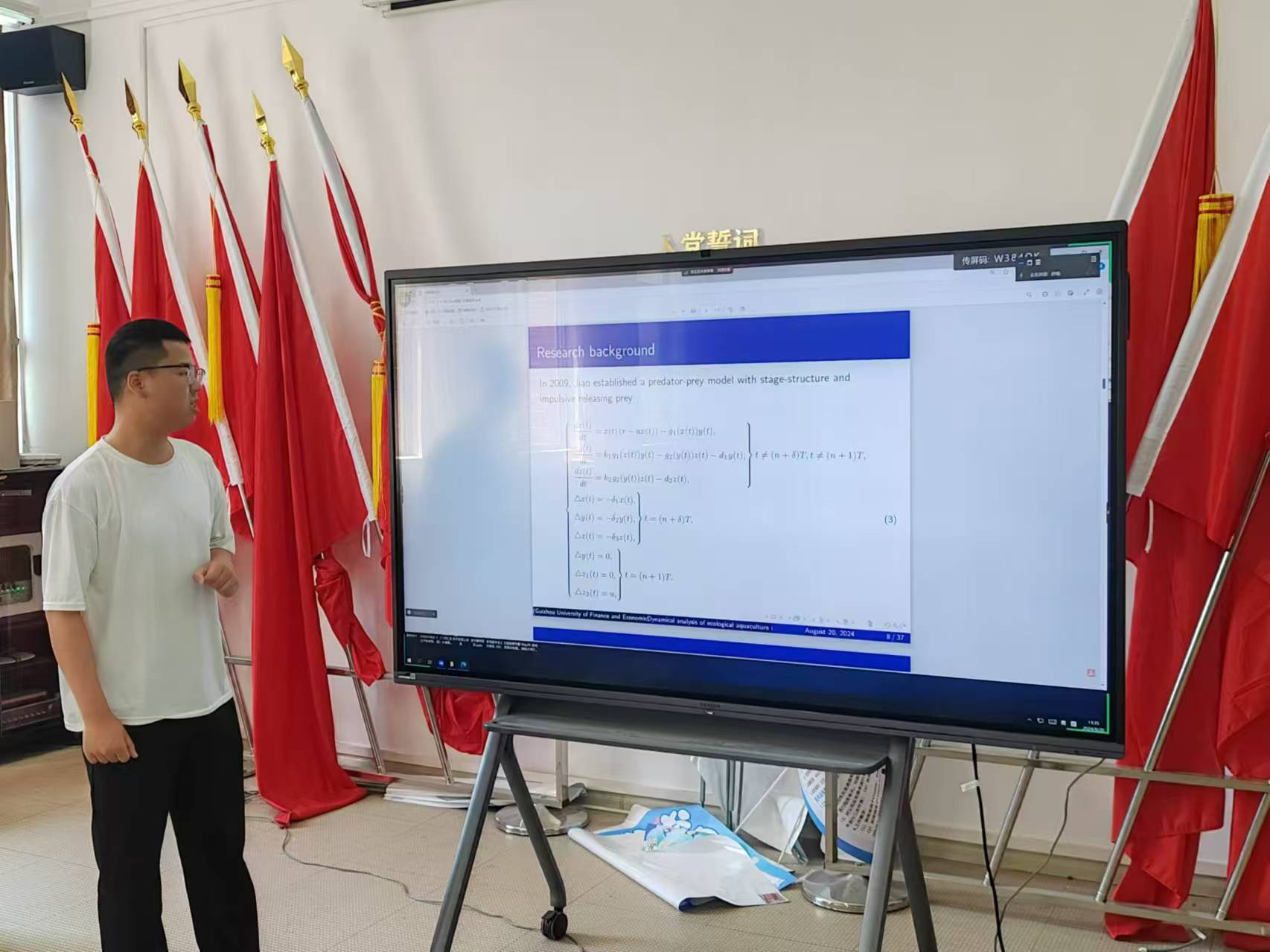 在学生学术汇报阶段,学院十六位研究生和六位本科生分别汇报了各自领域取得的进展和成果,包括害虫具有冬眠特征和脉冲非线性释放天敌的害虫管理动力学系统研究、基于多策略融合改进霜冰算法的特征选择方法、高维数据下偏正态回归模型的贝叶斯统计推断、一类二阶有理差分系统的动力学行为、权为λ的微分Hom-李三系的上同调及其应用等等方面。十六位研究生和六位本科生的精彩汇报,展现了我院蓬勃向上的学术探索力量。