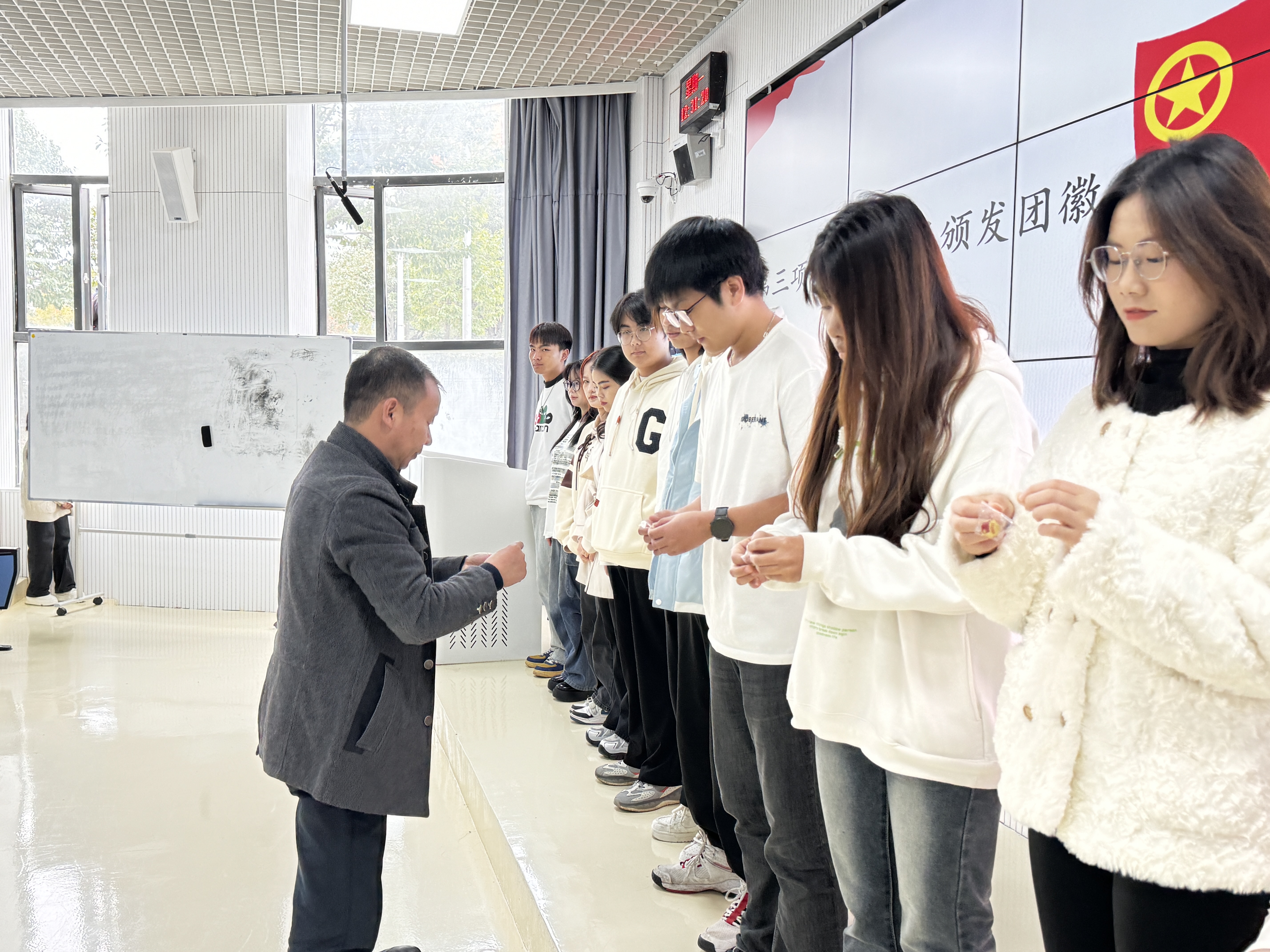 入团仪式在庄严的国歌中拉开序幕,接着新团员名单在全场期待中被宣读,朱吉韬老师为王甜等12位新团员颁发团徽。领誓人带领着新团员庄严宣誓,入团介绍人代表李乐优宣读《团章》中团员的义务和权利条款,新团员们认真聆听,深刻领会,为今后更好地履行团员职责奠定了基础。新团员代表谢言慧与老团员代表张璐相继发言,新团员立志以实际行动践行入团誓言,老团员则表示将继续发挥模范带头作用,携手共进。最后,朱吉韬对新团员提出了殷切期望与明确要求,鼓励全体团员在学习、工作和生活中勇挑重担,争做时代先锋。