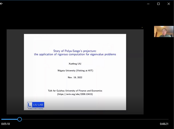 11月19日,小象直播 邀请日本新潟大学刘雪峰副教授在线上腾讯会议作讲座。刘雪峰教授为我院师生作题为“从Polya-Szego关于多边形区域的特征值优化问题的猜想谈起--关于特征值问题的严格计算和应用”的学术讲座。学院师生代表40余人参与此次讲座。
