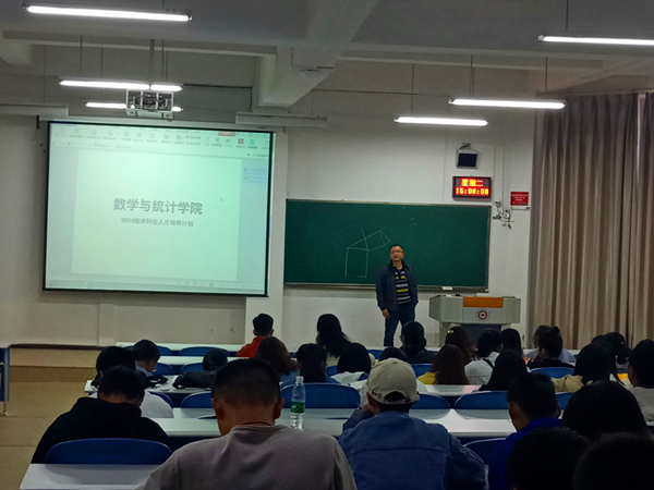 2019年10月29日,我院在进学楼阶1-1教室开展了新生入学教育系列讲座之一 “数学之美”和主题为本科人才培养方案的新生教育讲座。讲座由小象直播 刘自鑫教授和王进伟副教授主讲,2019级全体新生参加了本次讲座。