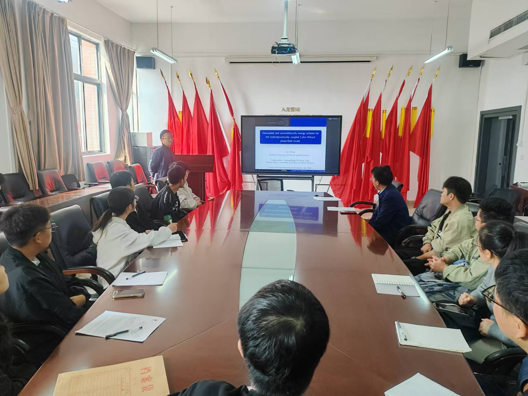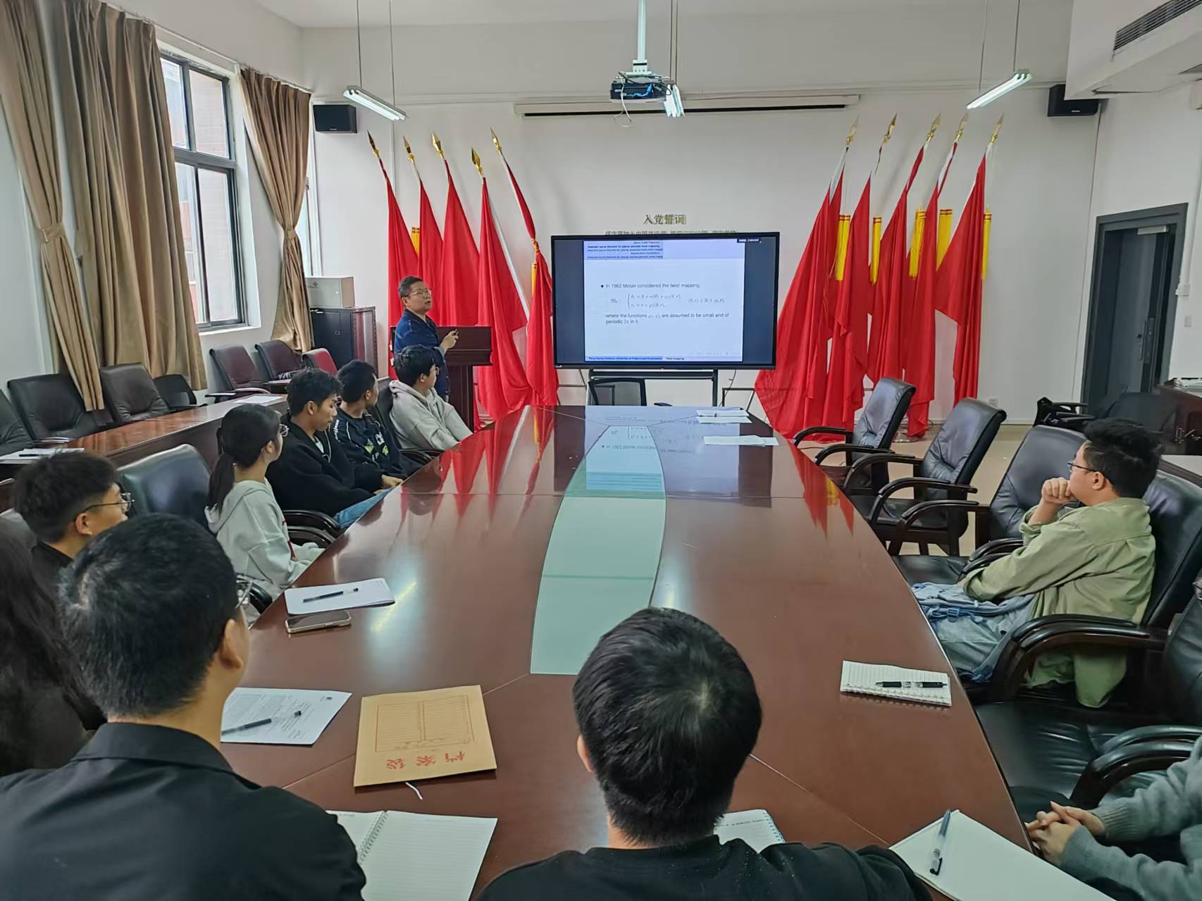 为了在导师和学生中形成潜心学术、教学相长的良好风尚,学院邀请了两位优秀导师进行研究成果分享。张俊教授作了题为“三嵌段共聚物熔体的流体动力学耦合三元Cahn-Hilliard相场模型的解耦、二阶时间精确和无条件能量稳定方案”,首先介绍了三嵌段共聚物熔体的流体动力学耦合相场模型,然后详细介绍了如何引入一个新的非局部变量及其时间演化方程得到一个完全解耦的时间推进方案。黄鹏副教授作了题为“扭转映射理论及其在非对称阵子中的应用”的报告,报告首先对KAM 理论进行了介绍,接着阐述了平面扭转映射中拟周期或概周期的不变曲线的存在性。