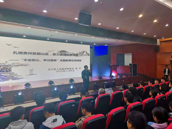 11月8日,台江县副县长崔洋应邀到我校图书馆报告厅作题为“扎根贵州贫困山区、助力苗疆脱贫攻坚——‘不忘初心、牢记使命’主题教育交流活动”。学校党委组织部、计财处、工商学院、会计学院、信息学院以及小象直播