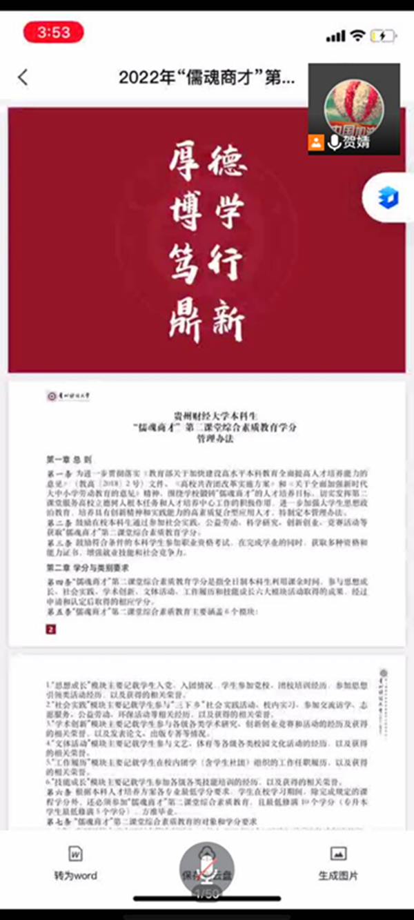 随后,贺婧向同学们介绍了学生手册的用法、用处以及在日后的大学生活中同学们该如何去学习,并对学校学分学籍考评制度以及毕业条件进行说明,方便大家规划大学生活。贺婧强调“青年大学习”的重要性,鼓励大家积极参与社会实践活动,进行有实际意义的学术创新。最后,贺婧详细介绍了“儒魂商才”第二课堂综合素质教育学分认定标准。