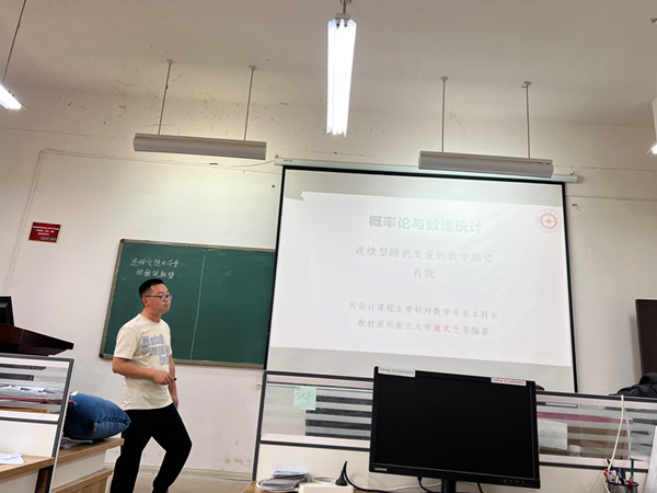本次观摩课由我院新进教师肖凯博士主讲,教学内容是《连续型随机变量的数学期望》。肖老师从离散型随机变量的数学期望开始,对连续型随机变量进行离散化,再从无穷积分的几何意义推导出连续型随机变量数学期望的计算公式,最后通过例题讲解让大家明白如何灵活应用计算公式。