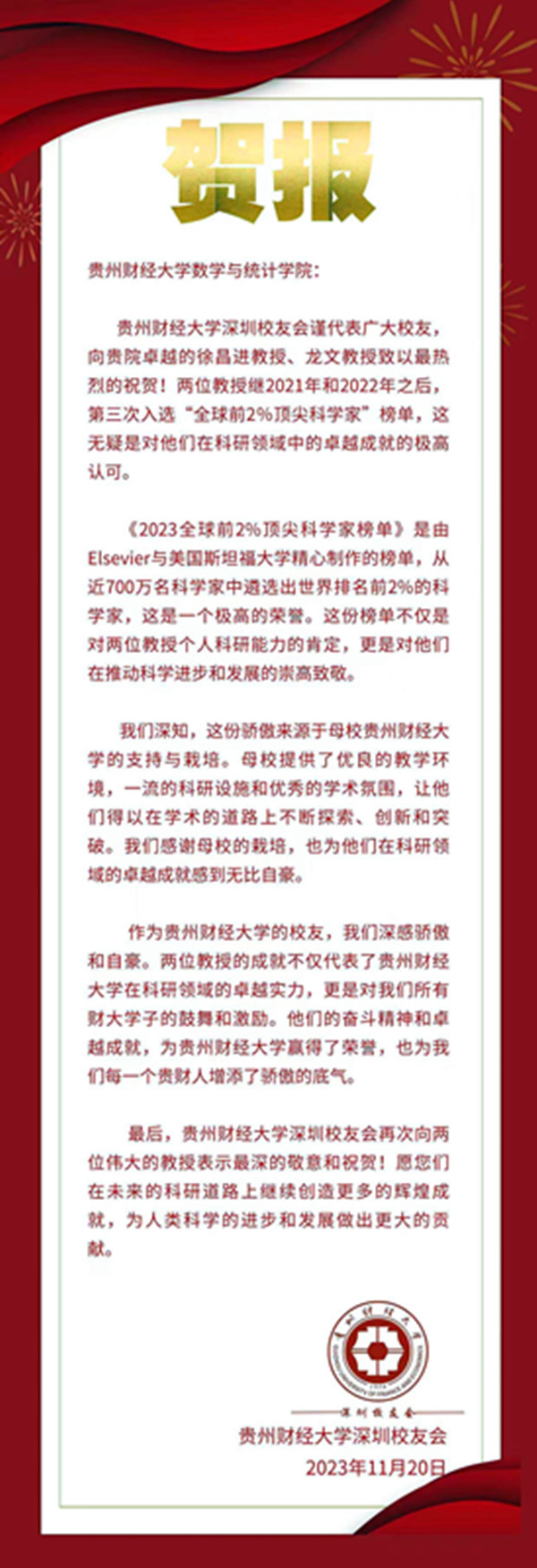 近日,小象直播 深圳校友会向小象直播 发来贺报,祝贺学院徐昌进教授和龙文教授继2021年、2022年之后第三次入选“全球前2%顶尖科学家”榜单,对学校培养了在科研领域有卓越贡献的杰出校友表示赞扬。