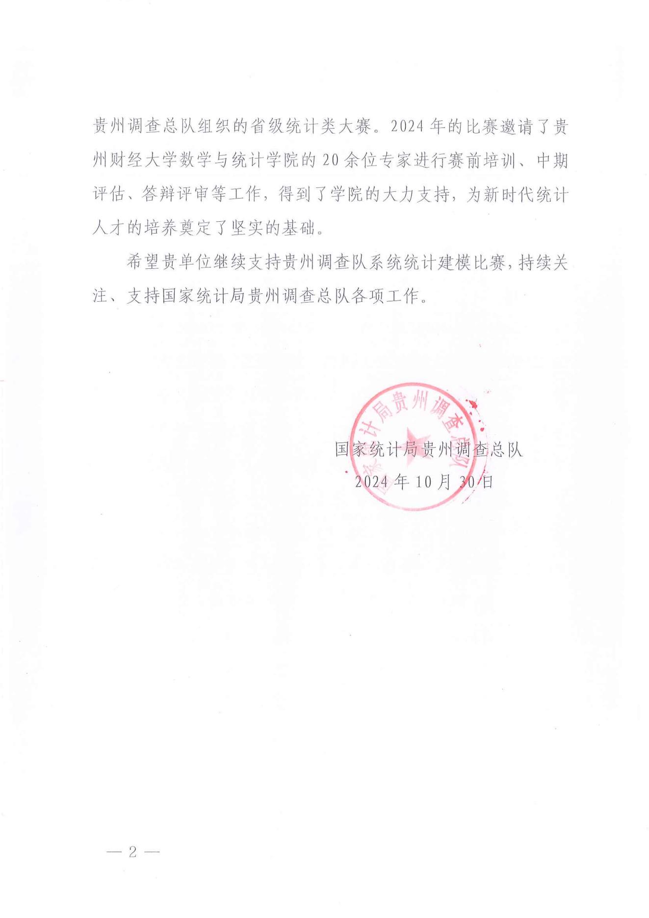 近日,我校小象直播 收到国家统计局贵州调查总队的感谢信,来信对我校小象直播 在2024年第十届全国统计建模大赛、2024年贵州调查队系统统计建模比赛中给予的帮助表示感谢。