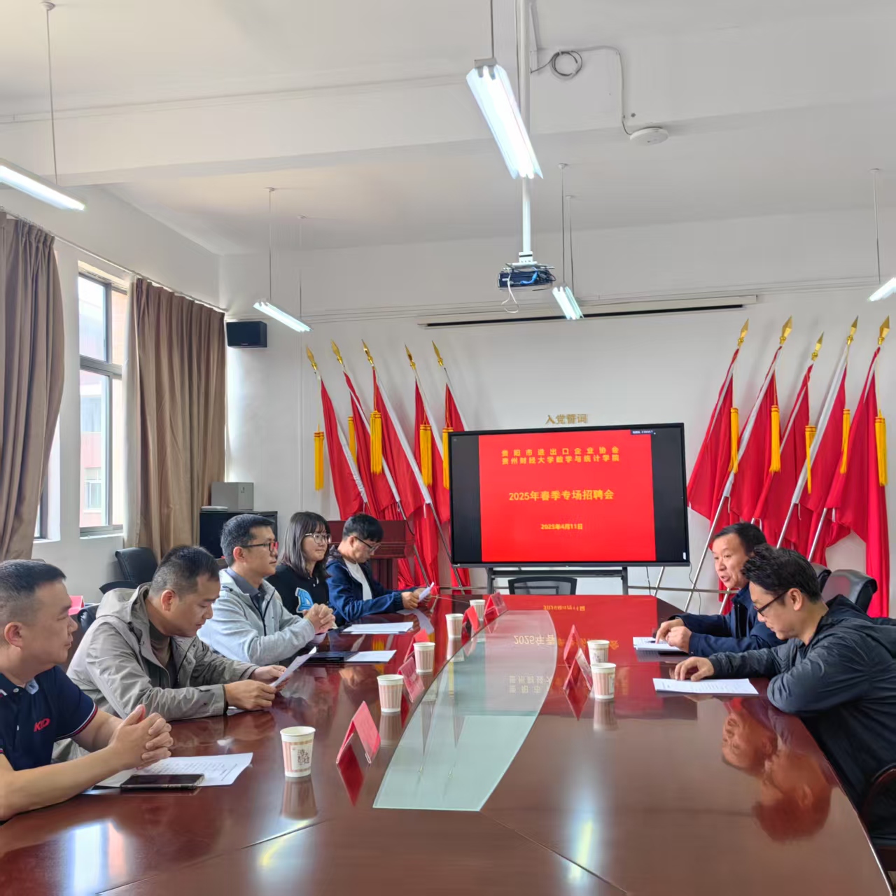 联合举办的2025年春季专场招聘会在志学楼331会议室举行。贵阳市进出口企业协会秘书长(贵州轮胎进出口有限责任公司负责人)梅志宏,贵阳市进出口企业协会办公室主任(贵州鲸飞数字供应链管理有限公司办公室主任)陈珂慧子,贵州创显智慧信息有限公司姚海峰,同方鼎欣贵州区域经理汤亚坤,四川商投贵州区域经理秦雷,小象直播