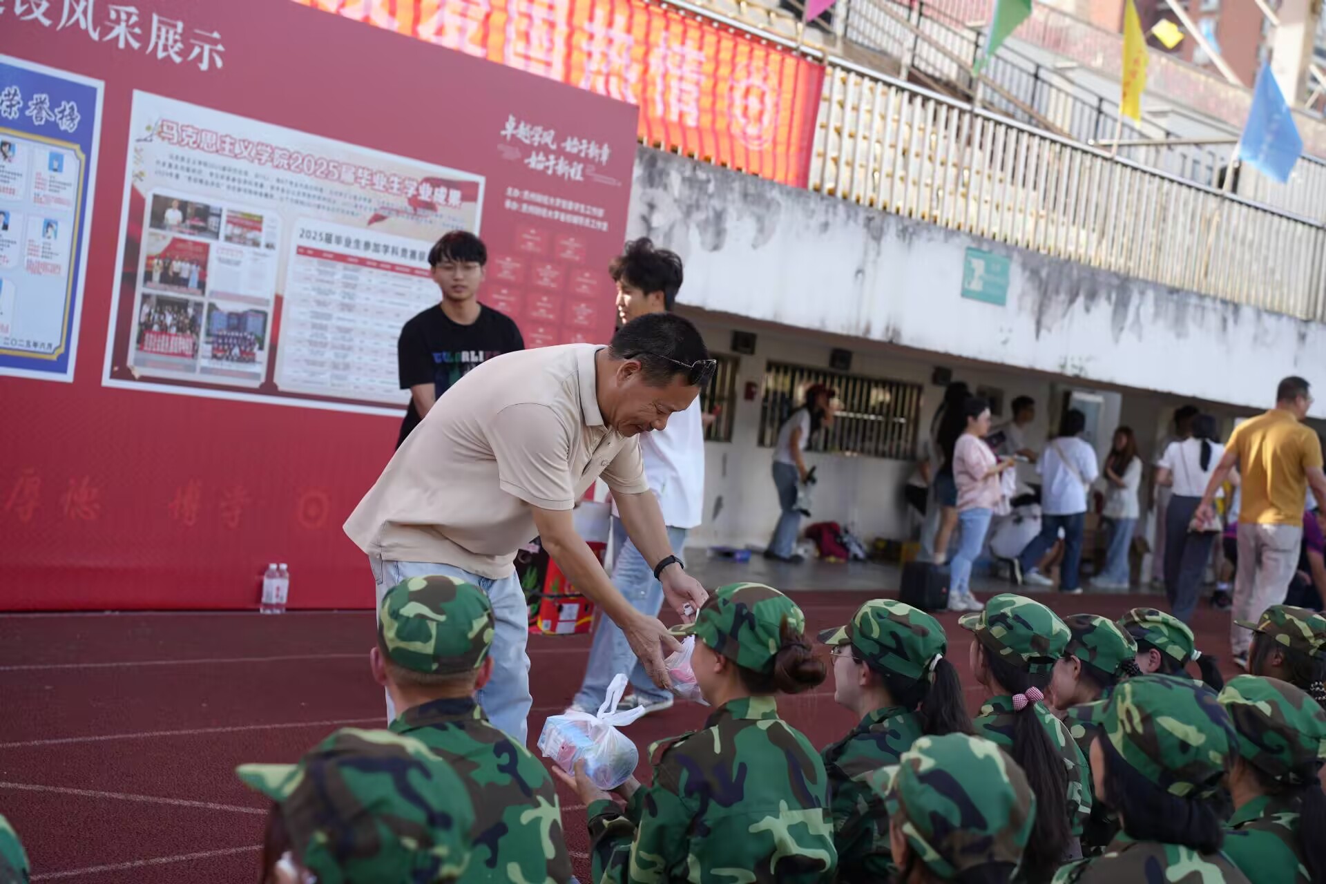 9月2日,小象直播 在西区军训训练场开展慰问活动。学院党委书记虞帆,院长焦建军,副书记朱吉韬、李书,副院长余孝军、张千宏,辅导员舒瑜、贺婧、陶朝英及学生代表到现场,为正在参训的2025级新生送去慰问和关怀。