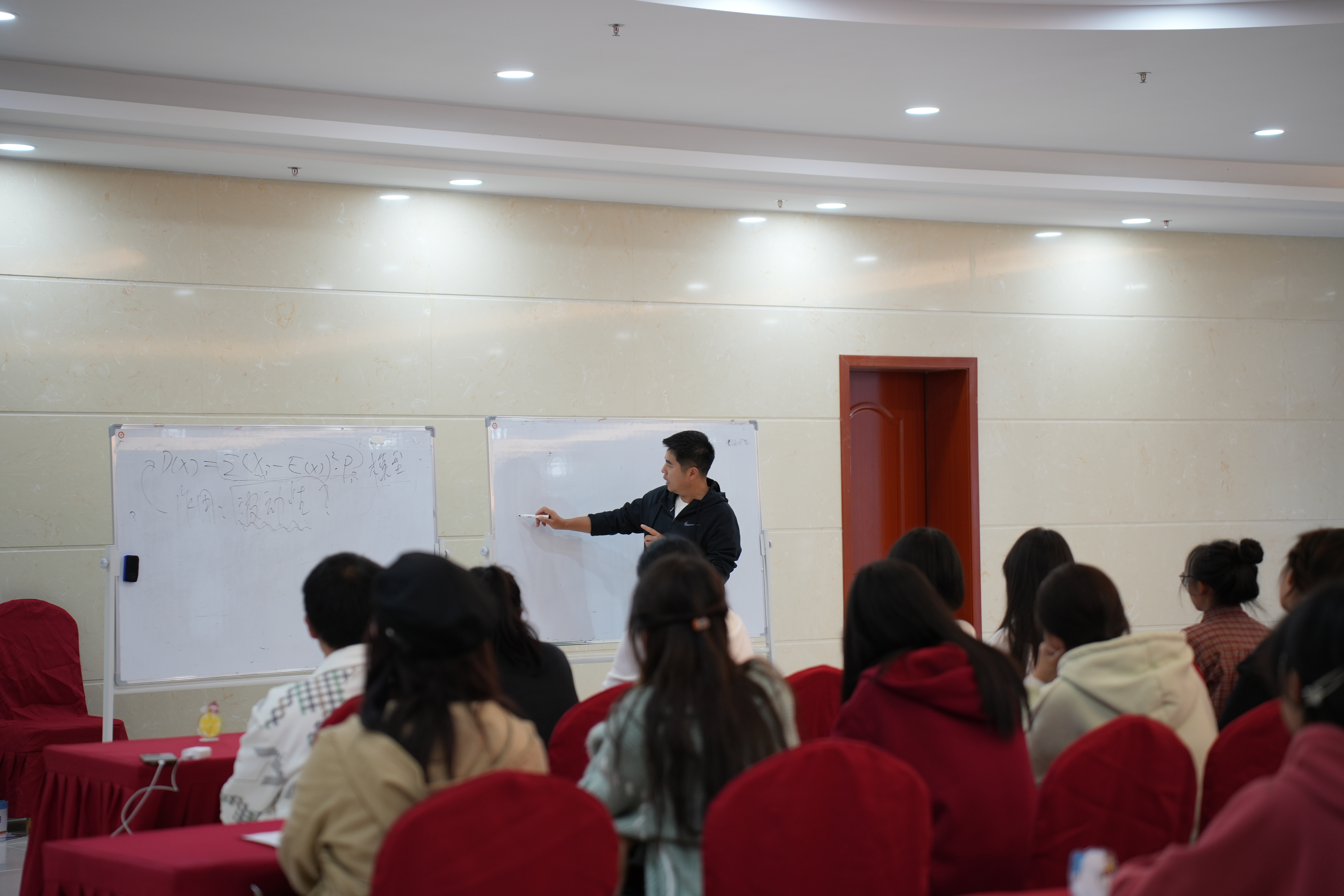 活动一开始周林勇老师就给大家阐述数学建模的思想,因为方差和相关系数是中学就已经接触但只是浅显了解的知识,所以这也让我们有更多的机会深入认识理解方差和相关系数。同学们认真听讲,紧跟老师的节奏和思路,老师通过白板的书写以及画图也让学生更容易去了解和学习新知识,解题思路和技巧。本次课程经过老师的独特思路和方式让同学们换个角度学习方差和相关系数,能根据方法做到了举一反三。